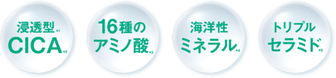 - 水、イソペンチルジオール、BG、グリセリン、ベタイン、ジグリセリン、リンゴ果実培養細胞エキス、コンフリーカルス培養エキス、ライラック葉培養細胞エキス、ツボクサエキス、マデカッソシド、アシアチコシド、PCA亜鉛、リシンHCl、バリン、イソロイシン、フェニルアラニン、トレオニン、ロイシン、ヒスチジンHCl、アルギニン、タウリン、アラニン、セリン、プロリン、グルタミン酸、グリシン、アラントイン、クラドシホンノバエカレドニアエ多糖体、海水、セラミドNP、セラミドNG、セラミドAP、水溶性プロテオグリカン、ヘキサカルボキシメチルジペプチド-12、水溶性コラーゲン、加水分解コラーゲン、ガラクトミセス/シラカンバ樹液発酵液、ジペプチド-15、ティーツリー葉油、イノシトール、シリカ、グリチルリチン酸2K、ヒアルロン酸Na、ビオサッカリドガム-1、ペンチレングリコール、イヌリン、グリコシルトレハロース、PVP、スクワラン、プロパンジオール、(アクリル酸ヒドロキシエチル/アクリロイルジメチルタウリンNa)コポリマー、水酸化K、ジイソステアリン酸ポリグリセリル-10、カルボマー、加水分解水添デンプン、(アクリレーツ/アクリル酸アルキル(C10-30))クロスポリマー、トリエチルヘキサノイン、メチルグルセス-10、水添レシチン、イソマルト、マルトデキストリン、キサンタンガム、レシチン、フィトステロールズ、フェノキシエタノール