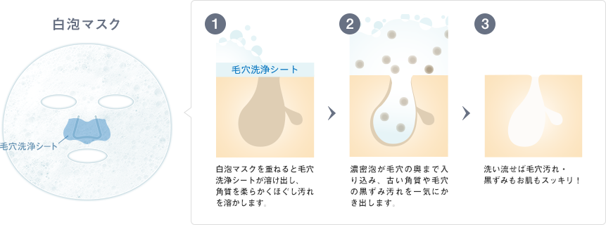 4.10〜15分程おきます。シートマスクをはがすと毛穴洗浄シートは柔らかく溶けています。残った毛穴洗浄シートと泡を水かぬるま湯でやさしく洗い流します。